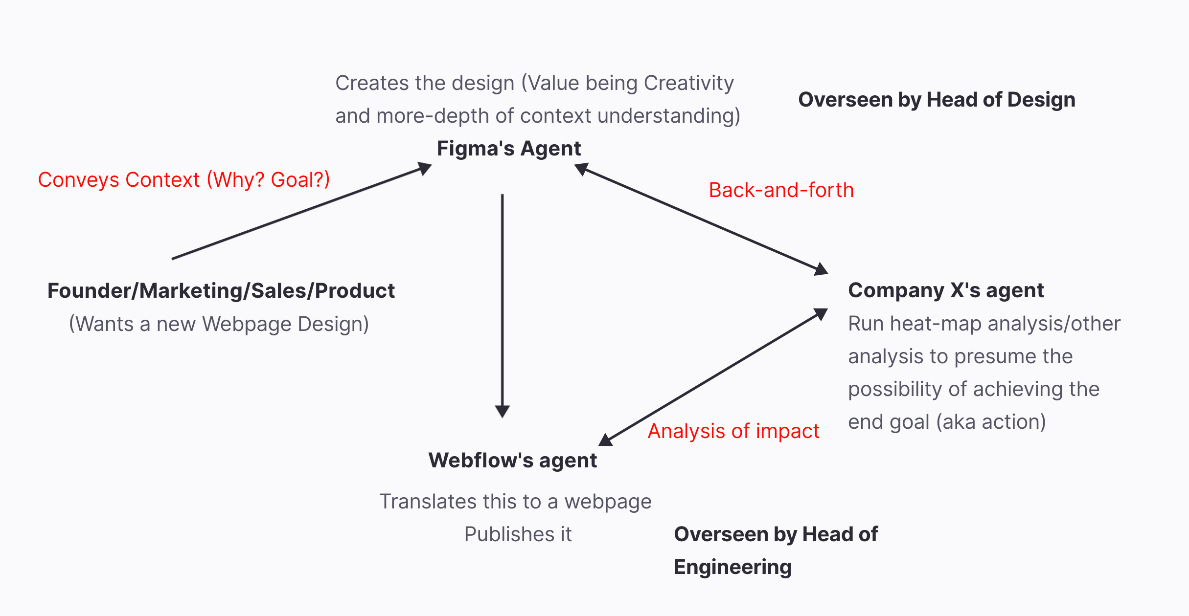 Figma autonomous agent takes the requirement (why? Goal? Previous context) and spins up multiple multiple designs. The Head of Design/Founder/Marketing/Sales reviews it, makes changes in the web app, or just prompts it