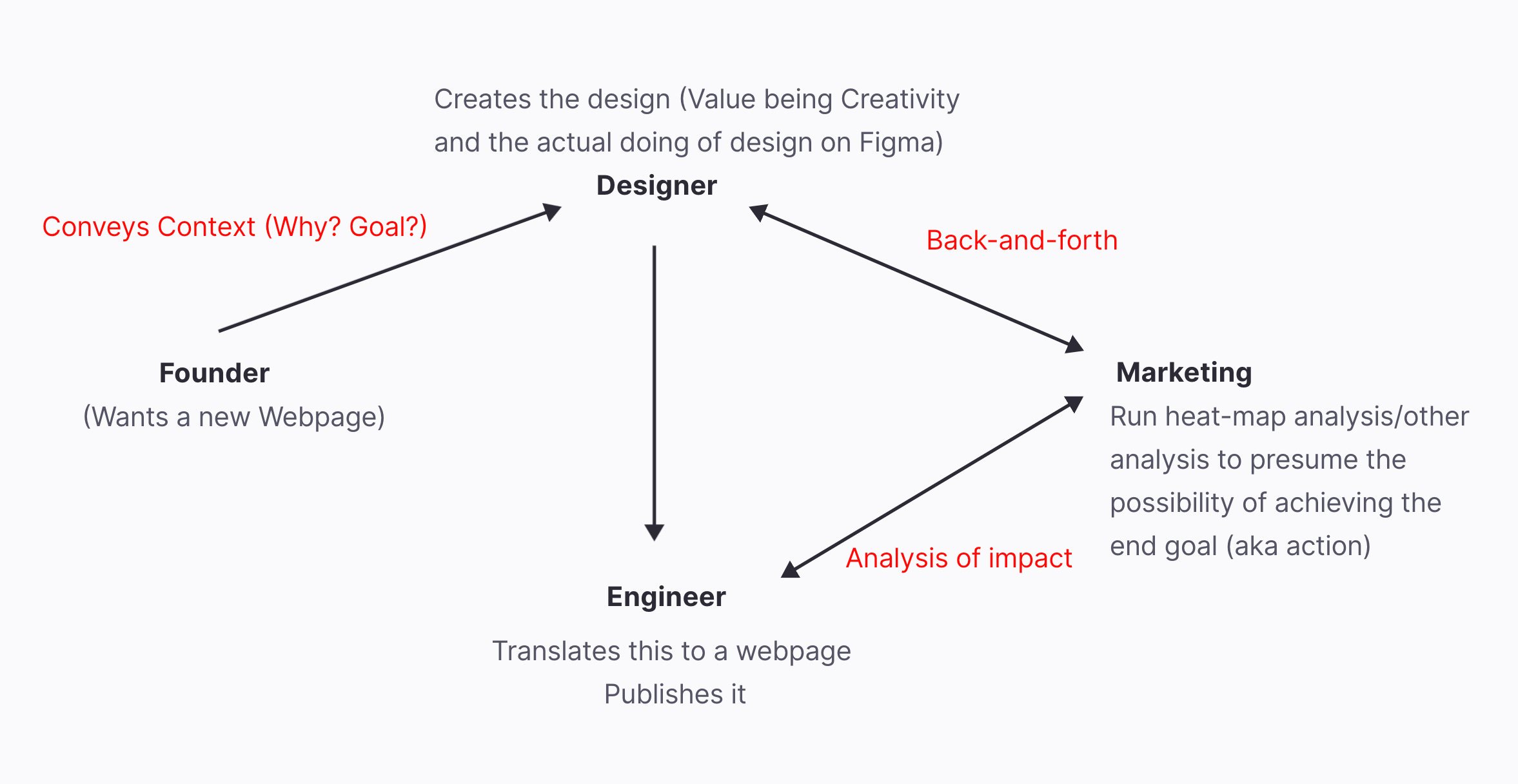Let’s take an example: I am a business that wants to create a design for my webpage to be given to my engineer. What do I care about? Good Design that communicates my business, leading to action (Conversion, buying, booking a demo, etc.).